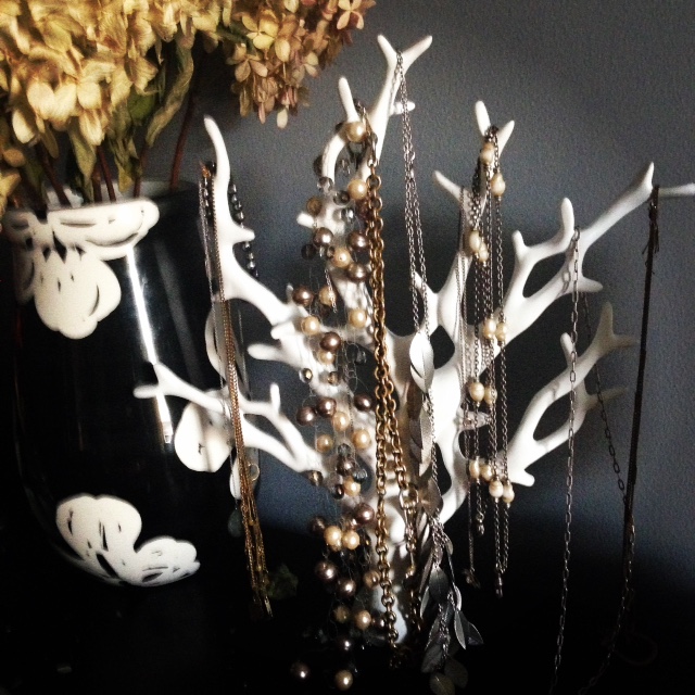 For a long time I tried to think of a really original way to display my necklaces and keep them untangled. I thought about finding a cool branch somewhere and hanging it up, but my handyman skills are nil and, you know, BUGS. So I finally gave up and bought this faux coral jewelry organizer at a local shop where the part of the proceeds go to help developmentally disabled adults. If I can’t be Martha Stewart, I can at least be socially responsible while I consume.