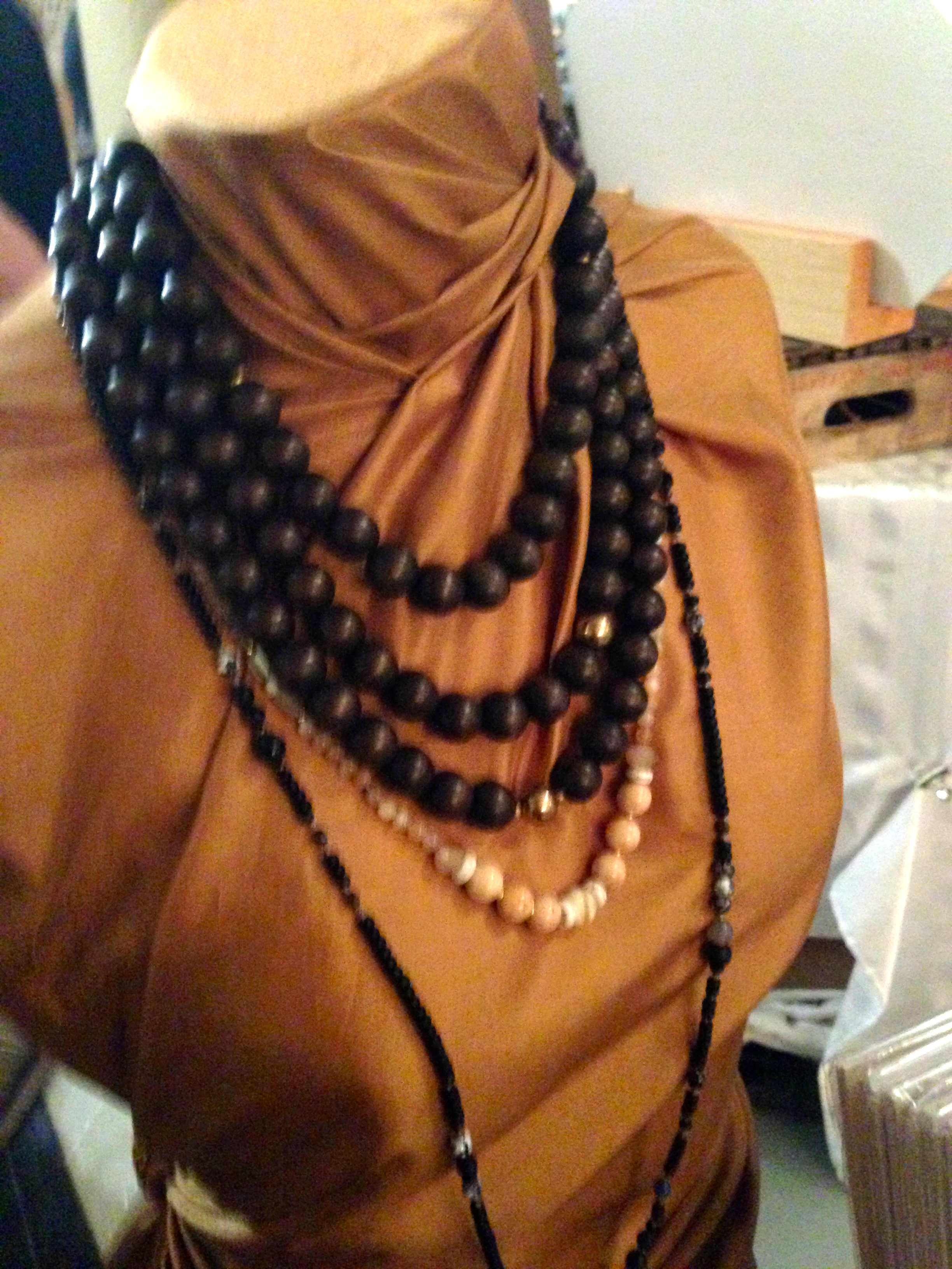 Spanjer handmade beaded chain necklace with fire agate, Tibetan agate, black onyx, jade, wood, and brass. (Photo courtesy of Carlyn Janus.)
